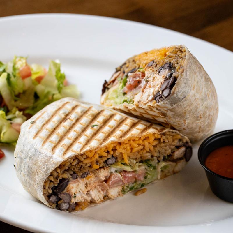 Made with yellow rice, beans, melted Jack and cheddar cheese & our homemade roasted tomato sauce | Whole wheat tortilla available add $1.50 | Naked Chimichanga available!